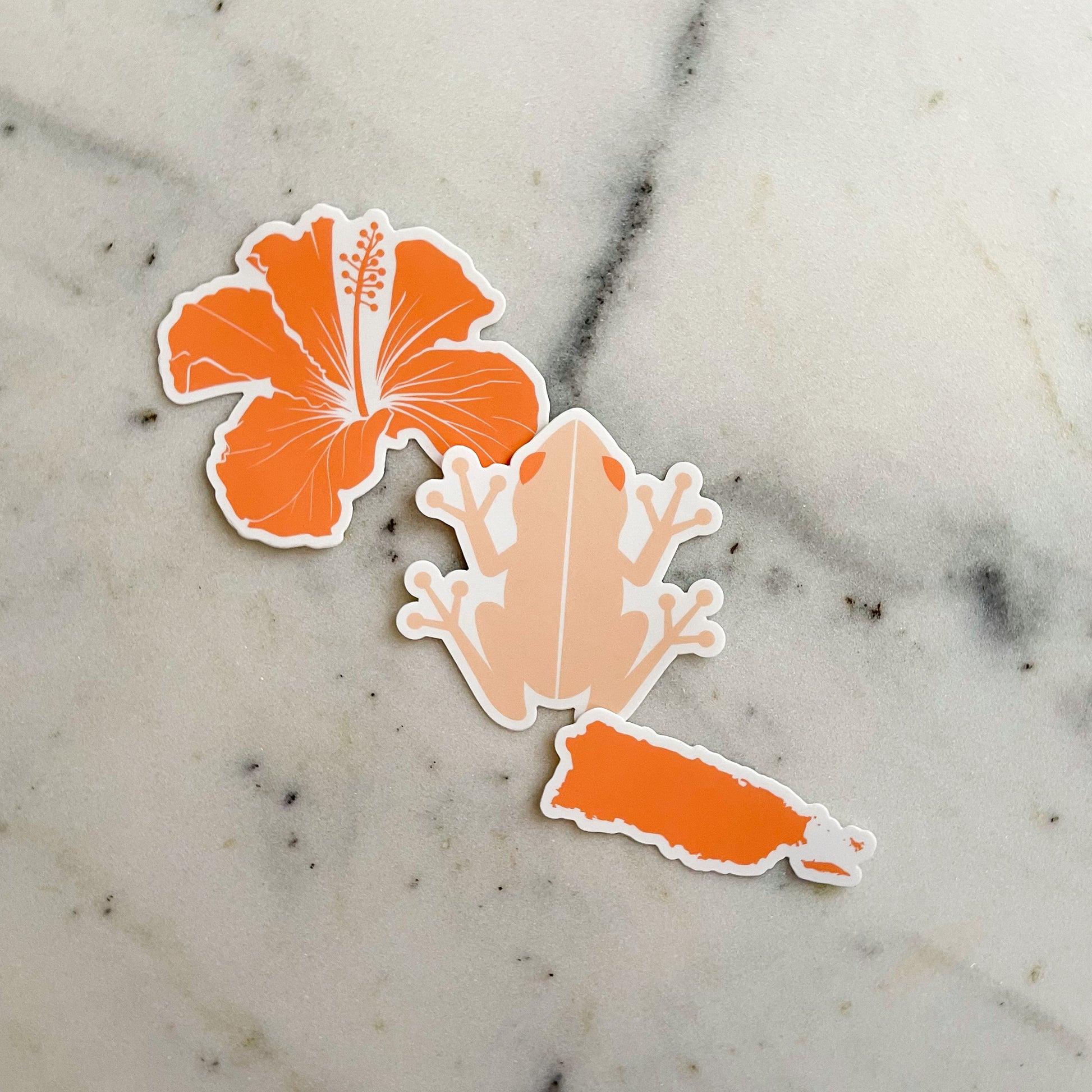 Sticker pack with 3 Puerto Rico-themed decals: the flor de maga, the island, and the coqui.