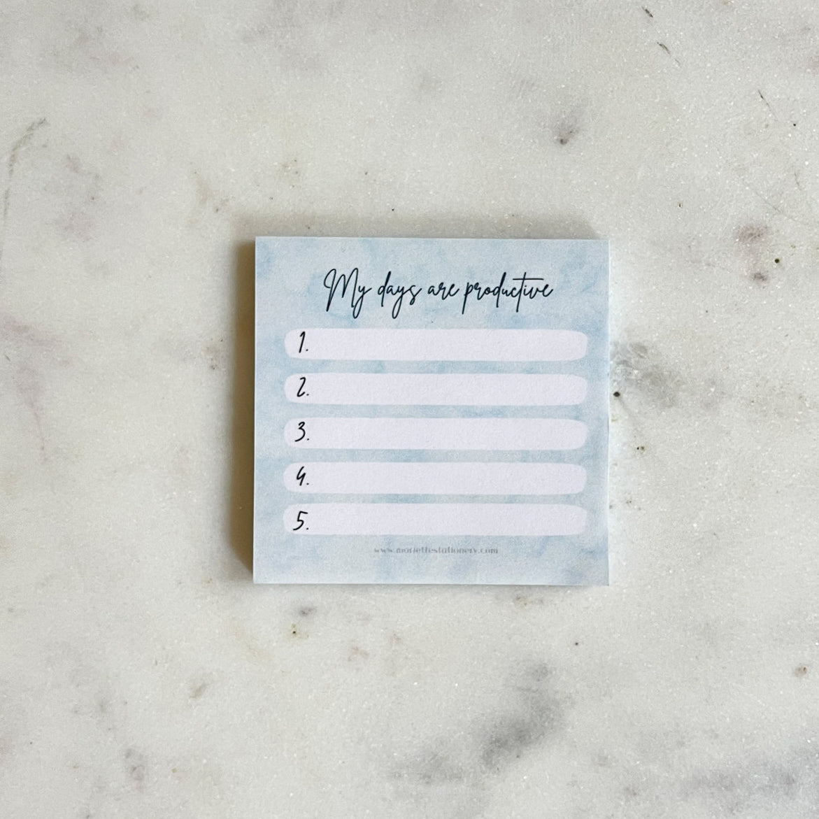 Feeling overwhelmed by your to-do list? Our "My Days are Productive" sticky notes are here to help! These vibrant 3" x 3" notes feature a powerful affirmation and a space to jot down your top 5 priorities for the day.